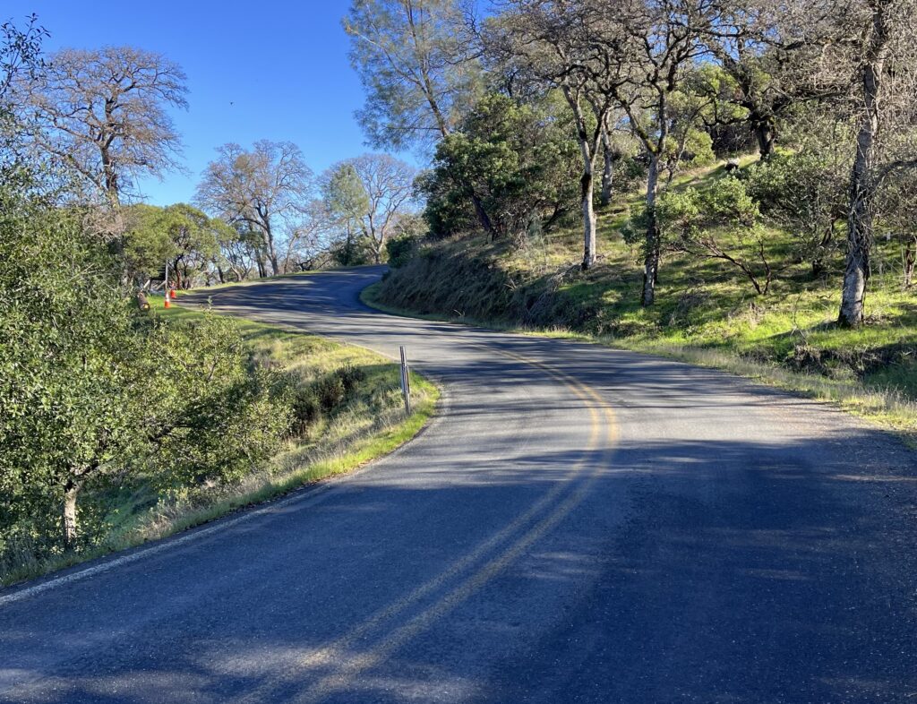 A word about ride scheduling: North, as its name implies, is on the north side of the ridge, which means it’s in shadow for most or all of the day. This is a lovely thing on a hot summer’s day, but in the winter it means it’s probably wet. On the January day when I rode it, with no rain at all in the recent weather systems, it was still soaking wet from dew at 2 pm and slippery as a result. On the other hand, in the winter the oaks have dropped their leaves (still gorgeous) and so the vistas on North Rd. and Sulphur Bank are superior.