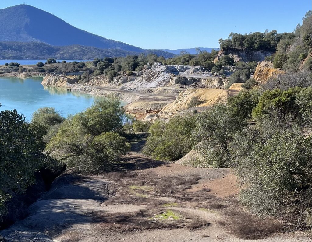 At the intersection of North and Sulphur Bank, you go L onto Sulphur Bank. You’re already near the summit of the SBD climb, but what remains is cherry, with great views of Borax Lake, the town of Clearlake, and the south arm of Clear Lake itself on your right and far below you. The back side of the hill is ideal riding, both climbing and descending—a little over a mile of 6-7%, with constant esses. As soon as you start down you get grand views of the north arm of Clear Lake, the community of Clearlake Oaks, and the Sulphur Bank between you and them. The bank, a shoreline hillside prominently dug away, is actually down a side road, Sulphur Bank Mine Road, signed with many protestations of privacy and promises of dire punishments meted out to trespassers, but the good views of the bank are a mere 1/8th of a mile down the road and you can easily pop down and poach a look-see. You can read about the history of the Bank here.